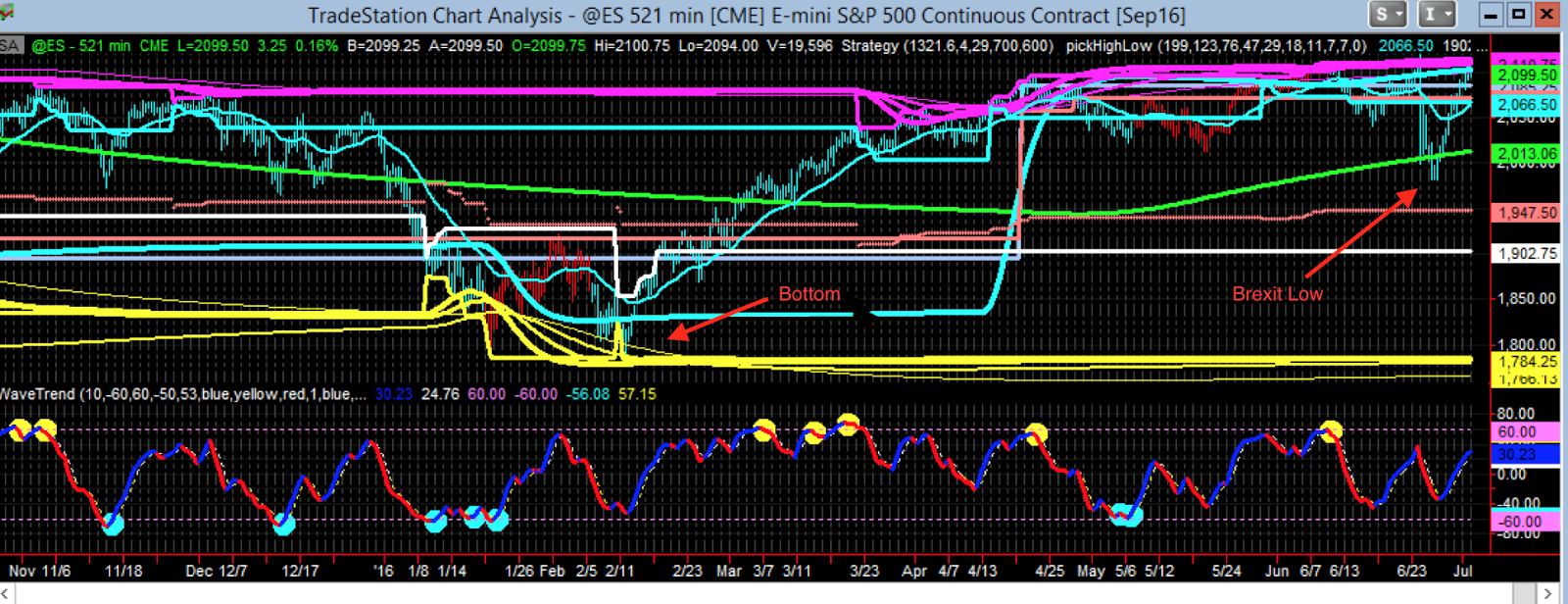 See chart below 521 minute ES with several different chaos indicator curves, it is rather clear why the turn-around from 1800 was not surprising. The recent Brexit spike down is also seen in this chart, and obvious there is the support green chaos indicator line at 2013.06